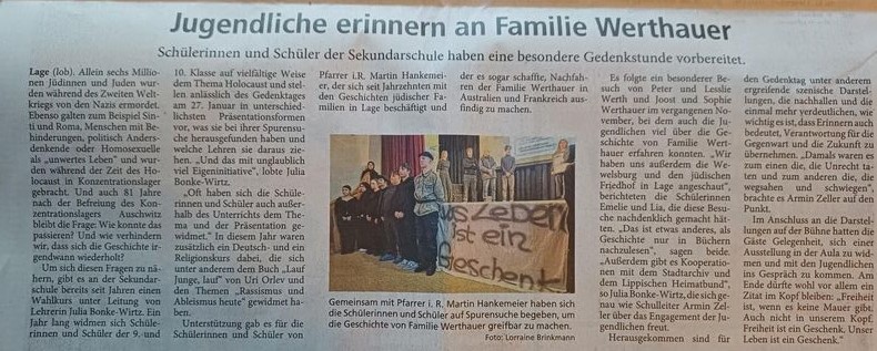 In diesem Jahr wurden Textpassagen aus dem im Jahrgang 9 gelesenen Buch „Lauf Junge, lauf“ genutzt, um symbolhaft zunächst eine Mauer zu errichten, die zum Ende der emotionalen Veranstaltung durch die Jugendlichen wieder abgebaut wurde. In einer Inszenierung wurden allgemeine historische Ereignisse wie das Pogrom vom 9.11.1938 ebenso dargestellt, wie spezielle Begebenheiten wie das Schicksal der Lagenser Familie Werthauer. Mit der angesehenen Lagenser Familie, die bis nach Australien vor den NS-Gräueltaten flüchtete, beschäftigte sich das Profil von Frau Bonke-Wirtz. Es war im Vorfeld sogar gelungen, einige Nachfahren im November 2025 in der Schule zu Gast zu haben. Zum Ende der Veranstaltung, die unter anderem auch von Bürgermeister Matthias Kalkreuter verfolgt wurde, spannte Schulleiter Armin Zeller einen Bogen von der Vergangenheit in die Gegenwart, in dem er unter anderem dazu aufrief, bei Diskriminierung nicht wegzuschauen und aufmerksam sein und zu bleiben.