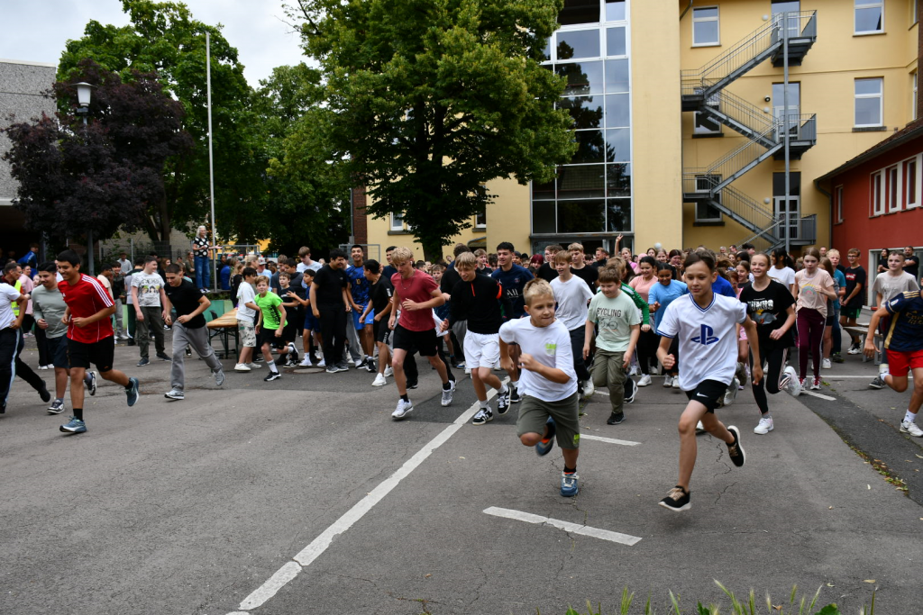 Sportlich wird es bei uns jedes Jahr auch kurz vor den Ferien, wenn der Sportaktionstag ansteht. Egal, ob Basketball, Fußball, das Fangspiel Catch oder unsere Supervölkerball-Variante: An diesem Tag sind immer alle mit vollem Einsatz dabei und am letzten Schultag, der bei uns immer mit einem gemeinsamen Frühstück beginnt, werden dann beim großen Ehrungsmarathon die Siegerklassen mit Sportmaterial ausgezeichnet.
