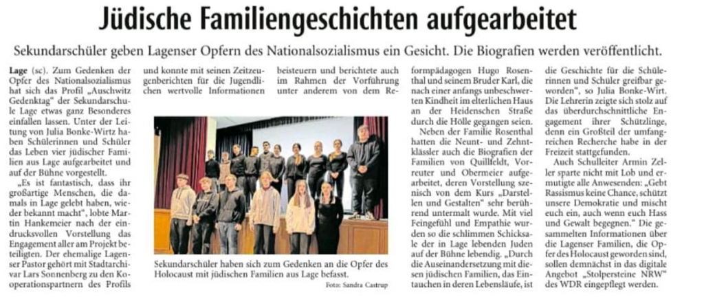 Das Profil „Auschwitz-Gedenktag“ von Frau Bonke-Wirtz hat sich kurz nach dem Holocaust-Gedenktag erneut etwas ganz Besonderes ausgedacht und das Leben vier jüdischer Familien aufgearbeitet und vor ausgewähltem Publikum wie Bürgermeister Matthias Kalkreuter auf der Bühne unserer Aula präsentiert. Auch die Zeitung berichtete ausführlich über diese besondere Gedenkaktion. Ein Dank geht an Frau Leßmann für ihre thematische und musikalische Unterstützung.