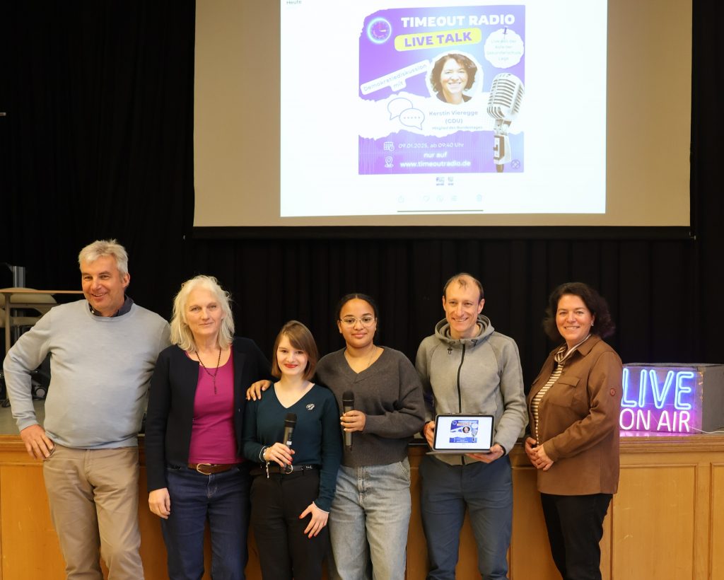 Geleitet und moderiert wurde die komplette Gesprächsrunde von Lillemor Orzech (10c) und Sessé Friedrich (9b), zudem wurde die Veranstaltung live über das Schulradio gestreamt und von über 110, in der Spitze 132, Zuhörern verfolgt. Das „Timeout-Radio“ ist ein anderes Profil der Sekundarschule, das seit zwei Jahren regelmäßig Sondersendungen zu verschiedensten Themen erstellt.
